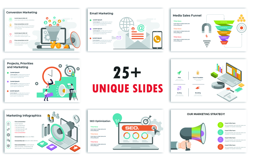 • 25+ different marketing slides to use for variety of purposes and various business and project presentations.